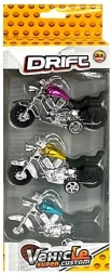 Motorcyklerne har friktionstræk: træk dem blot baglæns hen over underlaget, så suser de afsted. Ideelle til løb, fri leg eller som pynt på børneværelset. Pakket i en æske med gennemsigtigt vindue, så sættet er klar som gave.