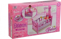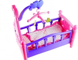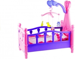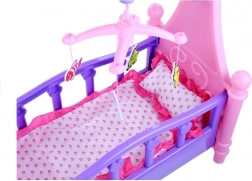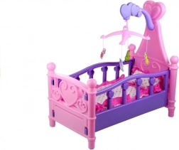Denne stilfulde dukkeseng minder troværdigt om en rigtig børneseng. Den pink‑lilla udgave med hjerter og ornamenter suppleres af en karrusel med hængende dyr, som hjælper dukken med at falde i søvn. Sættet inkluderer blødt sengetøj, der matcher sengens design.