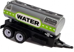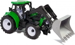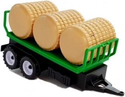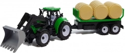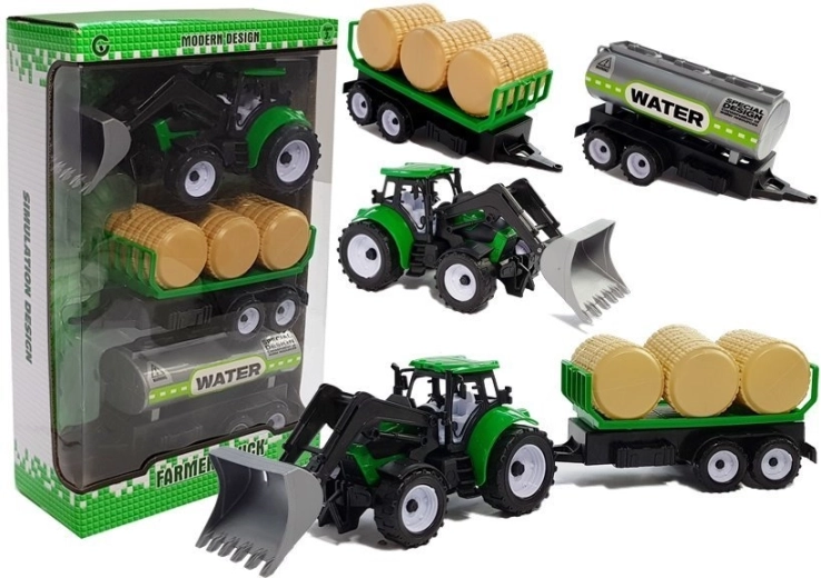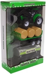Den grønne traktor har en åben førerkabine og detaljer i sort og hvid. Kigger man nøje på traktoren, vil man bemærke det fænomenale udstyr - førerkabinen har et førersæde, et rat og et instrumentbræt for nem betjening. På forsiden er der desuden monteret en gravekop. Der medfølger en trailer med 3 høballer og en vandtank. Køretøjet og trailerne er monteret på drejelige gummihjul med mønster.