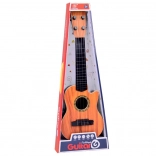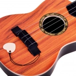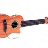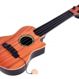 Børneguitar med 4 strenge i en attraktiv træimitation er designet til at ligge behageligt i hænderne selv på de yngste musikere. Fire metalstrenge og det medfølgende plekter gør det let at klimpre og lære de første akkorder, mens en enkel justering på halsen hjælper med at opnå bedre stemning.
