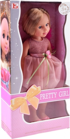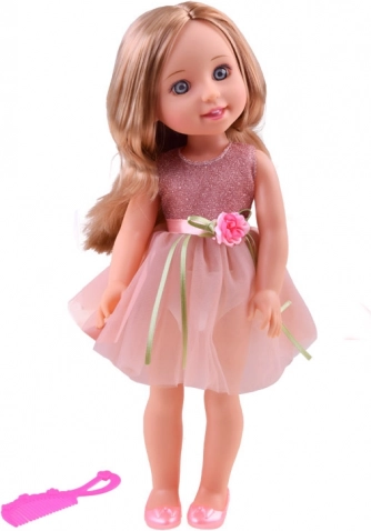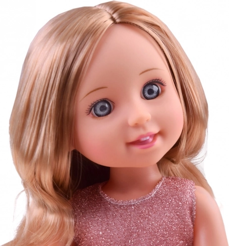 Denne elegante dukke i en blidt lyserød, glitrende kjole er ideel til leg med bal, femte-té og hverdagseventyr. Det lange blonde hår kan redes, styles og sættes op i forskellige frisurer, hvilket stimulerer barnets fantasi og finmotorik.