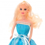 • Dukken er klædt i en smuk blå bal-kjole og har langt blondt hår.