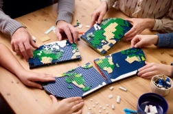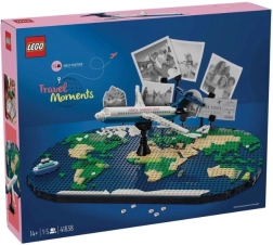 Forfin din kreativitet med familiekittet LEGO Rejseminder, som inkluderer verdenskortet og et fly til samling.