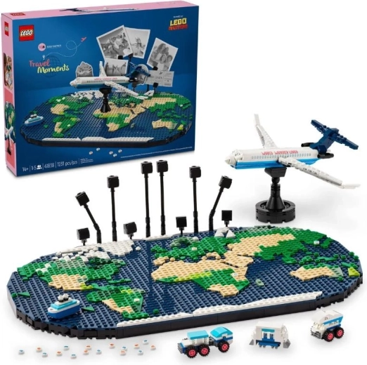 Det kreative sæt Rejseminder LEGO er den perfekte gave til rejsende og familier, der elsker eventyr. Sættet indeholder et verdenskort til at bygge, Wonderliner flyet, fire mikromodeller af køretøjer og mange andre tilbehør, herunder 20 lokationsplader og 10 fotoholdere.