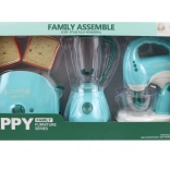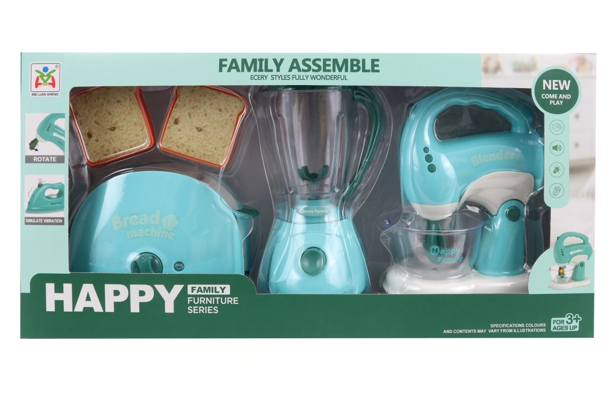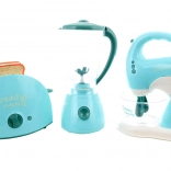 Dette sæt køkkenapparater indeholder en brødrister, en blender og en pisker. Hvert apparat drives af 2 AA-batterier, som ikke medfølger. Når batterierne indsættes, lyser brødristeren og afgiver lyde, blenderen roterer og afgiver lyde, og piskeren lyser, afgiver lyde, og piskerisene roterer. Materiale: plast. Pakket i æske. Pakkemål ca. 43×22×9,5 cm. Alder 3+.