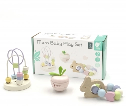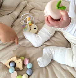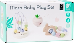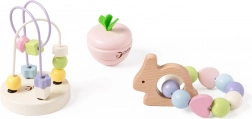 Det pastelfarvede, motiverende baby-legetøjssæt fra Classic World er designet til at bringe glæde og stimulere dit barns sanser allerede fra de første dage. Dette træsæt indeholder flere smukke elementer, som hjælper børn med at udvikle motorik og koncentration. Den glade kanin er en rangle med perler, der imponerer med sit farverige design og melodiske lyde. At ryste denne rangle stimulerer barnets nysgerrighed og understøtter udviklingen af høreevnen. Perlelabyinten er en anden del af sættet, hvor børn kan dreje og flytte perlerne, hvilket udvikler koncentration og motoriske færdigheder. Legetøjet i dette sæt har en blid tekstur og pastelfarver, hvilket er behageligt for både børn og forældre.