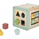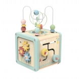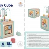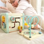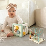 Denne multifunktionelle trækube understøtter barnets naturlige udvikling gennem meningsfuld leg. Pastelfarverne fanger opmærksomheden, mens de mange aktiviteter træner finmotorik, hånd-øje-koordination, logisk tænkning og genkendelse af former og farver.