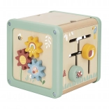 Toppen af kuben byder på farvede perler, der kan skubbes langs buede metaltråde og udvikler koordination og finmotorik. Spejlet vækker nysgerrighed og selvopfattelse.