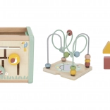 På oversiden finder du en motorisk labyrint med perler og et sikkert spejl, og på siderne form-sorter, roterende klodser med dyr, tandhjul og skinnebaner. Hver side giver en ny udfordring, så barnet øver tålmodighed, kreativitet og problemløsning.