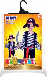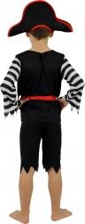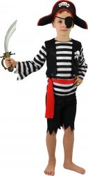 Pakken indeholder alt, hvad en lille kaper har brug for: overdel med piratdetaljer, bukser med “flosset” look, rødt bælte, klap for øjet og en stilfuld hat med piratsymboler. Sabel medfølger ikke, så den kan vælges efter egne præferencer.