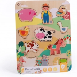 Takket være den robuste trækonstruktion og de glatte kanter er puslespillet sikkert og behageligt at røre ved. 12 dele giver den rette mængde udfordring for tumlinger og byder på masser af gentagen fornøjelse. Den farverige plade med en malerisk gård indbyder til leg og udvikler både fantasi og ordforråd.