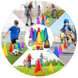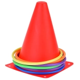 Dette sæt indeholder kegler og ringe i levende farver, der fanger opmærksomheden og sikrer sjov ved leg. De er perfekte til at markere legepladser eller stationer.