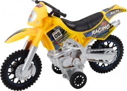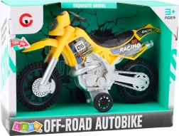 Denne motorcykel er lavet af holdbar plast, der tåler intensiv leg. Den gule farve og racerklistermærker giver et attraktivt udseende, mens de store terrændæk giver stabilitet på ujævne overflader.