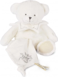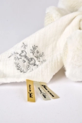 Bamsen er udstyret med et tæppe, som nemt kan gemmes i dens mave, hvilket er meget praktisk under rejser eller opbevaring. Doudou er dekoreret med fin broderi og satinbånd med franske tekster, som giver ekstra blødhed til hver krammestund.