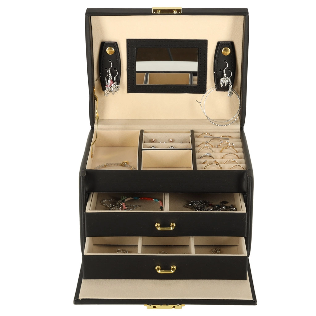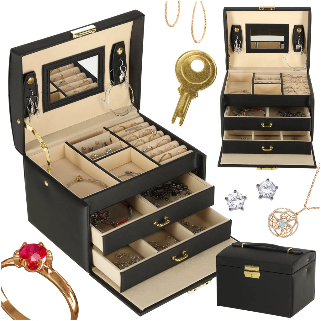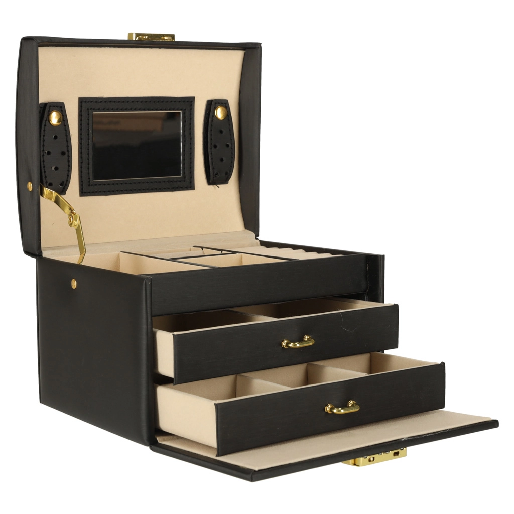 Elegant sort smykkeskrin med spejl og skuffer til overskuelig opbevaring af ringe, øreringe, armbånd og halskæder. Det tilbyder rumlige rum, to skuffer, blød foring mod ridser og låse med nøgle for øget sikkerhed. Den ideelle løsning til organiseret opbevaring af smykker derhjemme og på farten.