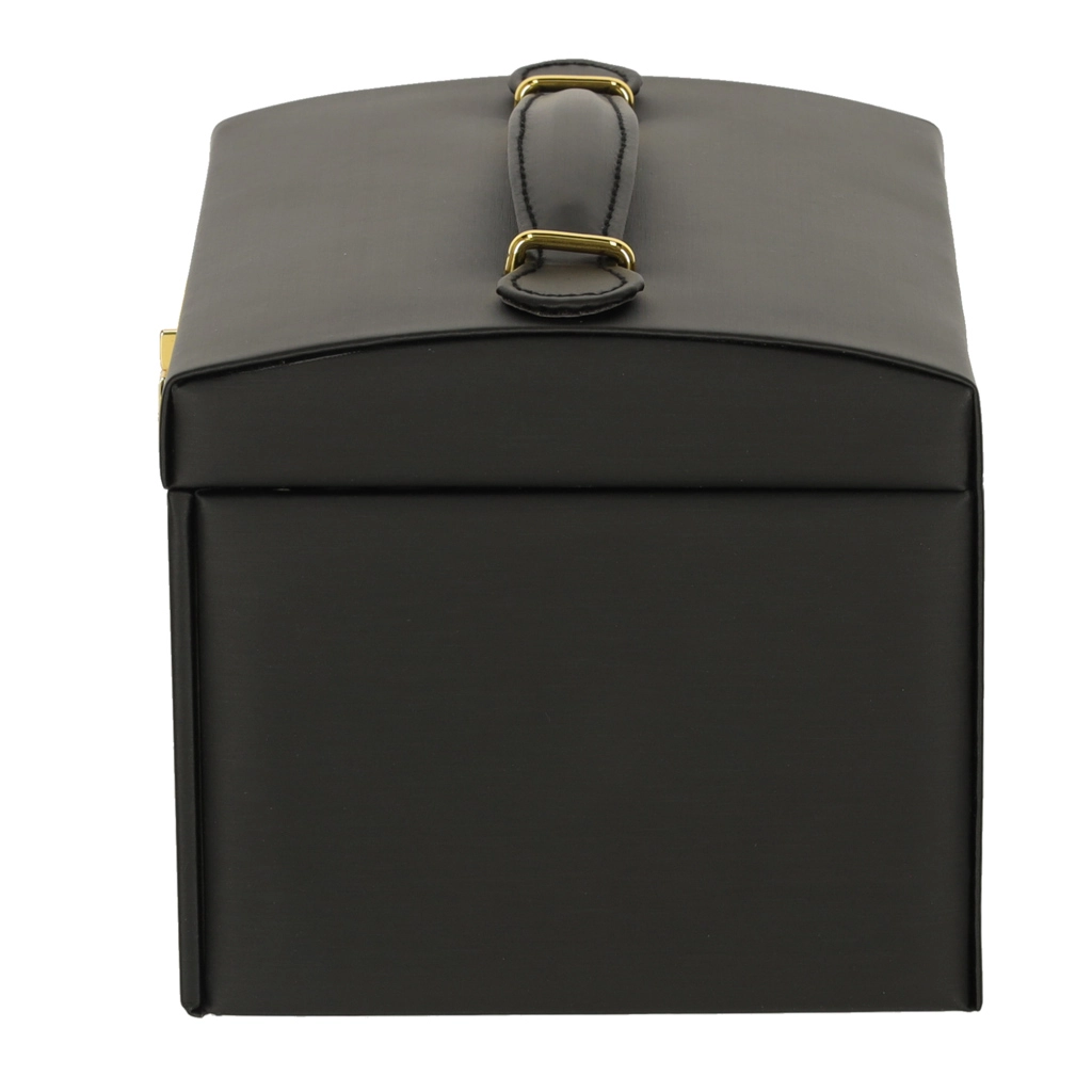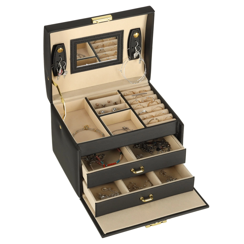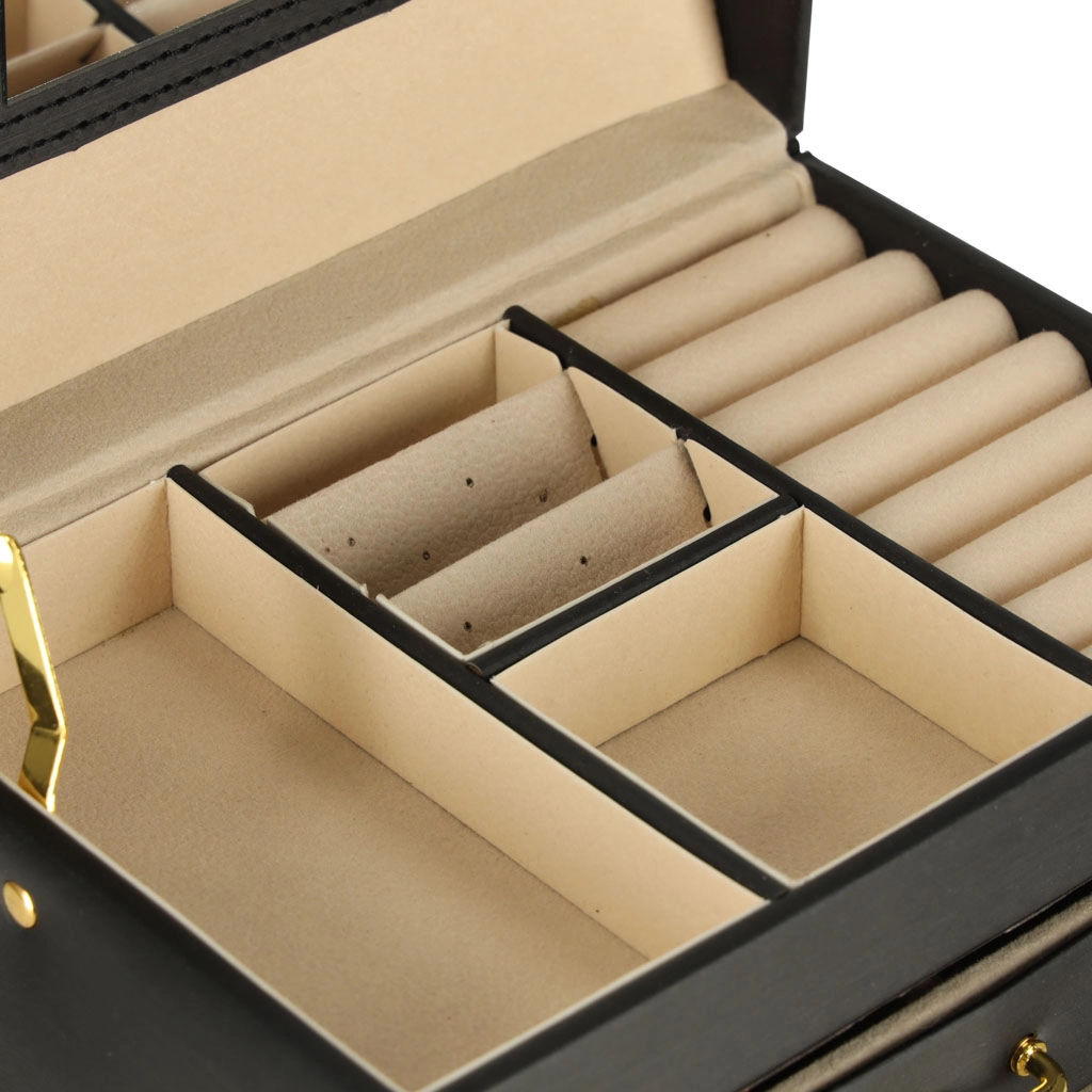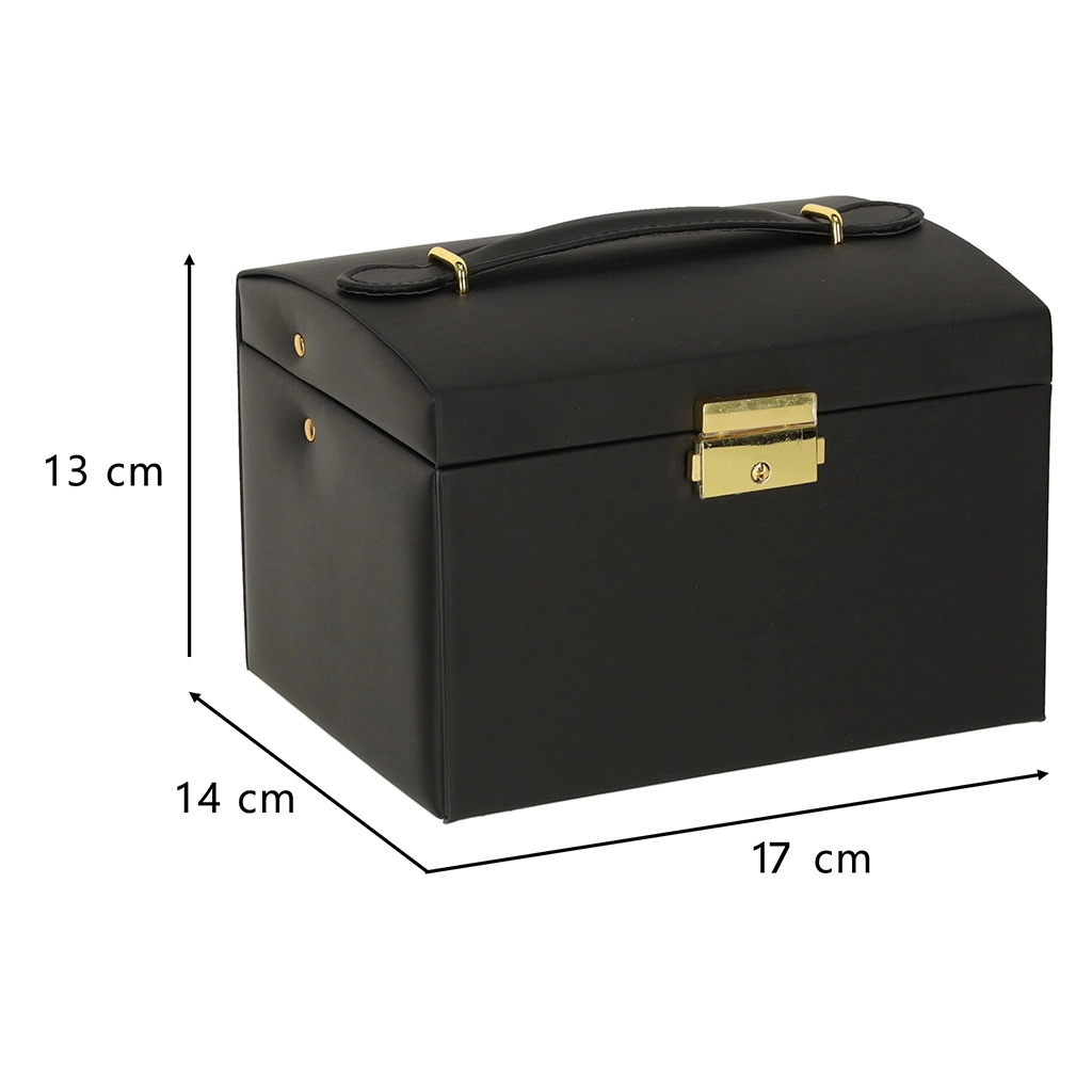 Elegant sort smykkeskrin med spejl og skuffer til overskuelig opbevaring af ringe, øreringe, armbånd og halskæder. Det tilbyder rumlige rum, to skuffer, blød foring mod ridser og låse med nøgle for øget sikkerhed. Den ideelle løsning til organiseret opbevaring af smykker derhjemme og på farten.
