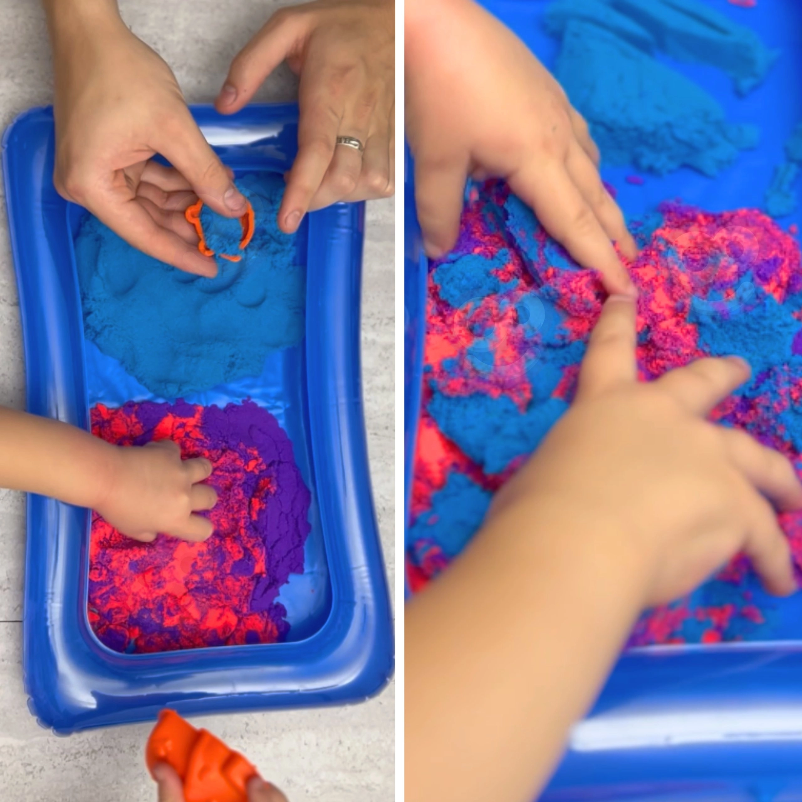 Kinetisk sand er blødt at røre ved, holder formen perfekt, klistrer ikke til hænderne og tørrer ikke ud – ideelt til mange timers leg.