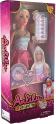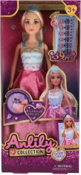Anlily-dukken på 30 cm begejstrer med elegante, glitrende kjoler i rosa nuancer og detaljer i blå og guld. Stilen fuldendes af en hårbøjle og realistiske lange hår, der indbyder til at børste og skabe frisurer. I pakken medfølger små “diamant”-pynt, der giver legen et strejf af luksus.