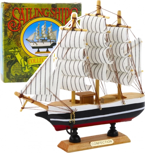 Denne kompakte model af et tremastet skib er en elegant kopi af et klassisk fartøj med kontrastfyldt design i sort, hvid og rød. De karakteristiske sejl med tynde striber og realistisk rig, sammen med den tremastede konstruktion, gør den ideel til udstilling.
