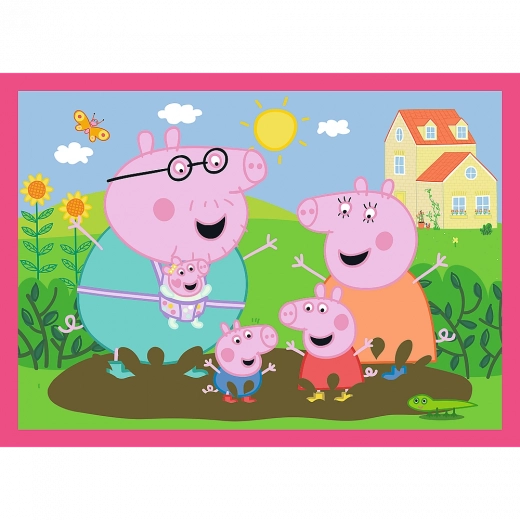 Oplev glæden ved at lægge puslespil med de populære figurer fra PEPPA PIG. Dette 4 i 1-sæt indeholder fire selvstændige motiver med forskelligt antal brikker, hvilket understøtter trinvis udvikling af motorik, tålmodighed og logisk tænkning. Hvert færdigt billede måler 285 × 205 mm – ideelt til små hænder.