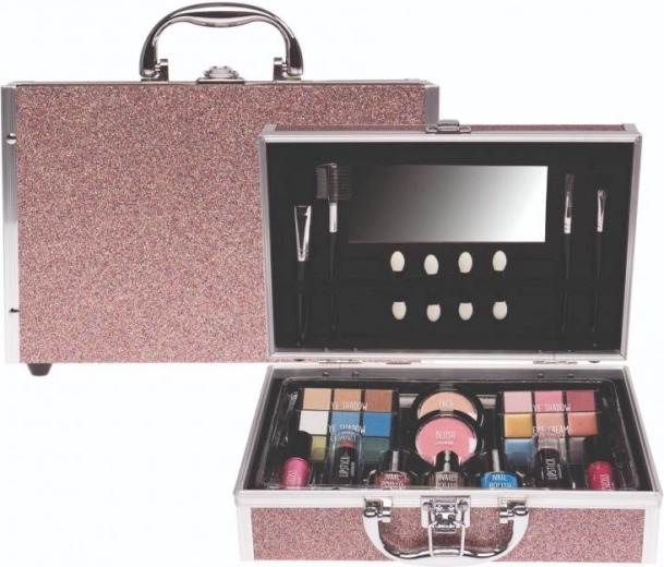 Stilfuld mellemstor kosmetikkuffert med glitrende design til overskuelig opbevaring og nem transport af dit udstyr. Ideel til både hjemme- og rejsebrug, med rigelig plads til makeup og tilbehør. Praktisk, holdbar og elegant hjælper til den daglige organisering af kosmetik.