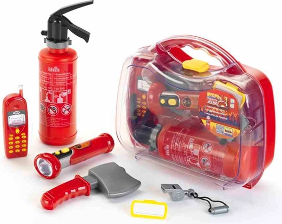 Komplet redningsleg for små helte! Denne brandmandskuffert indeholder alt, hvad der skal til for actionfyldte eventyr: funktionel brandslukker med sprayfunktion, mobiltelefon, økse, navneskilt, fløjte og lommelygte.