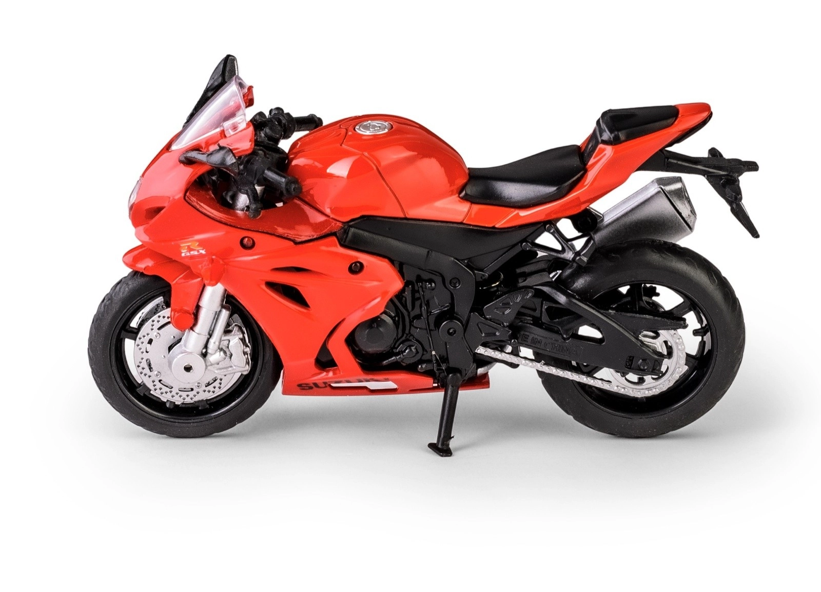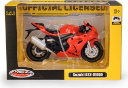 Den røde SUZUKI GSX‑R1000 i skala 1:18 er en tro kopi af sportsmotorcyklen med præcise detaljer. Metal- og plastdele, realistiske kåber og tryk giver et attraktivt udseende både til montre og leg.