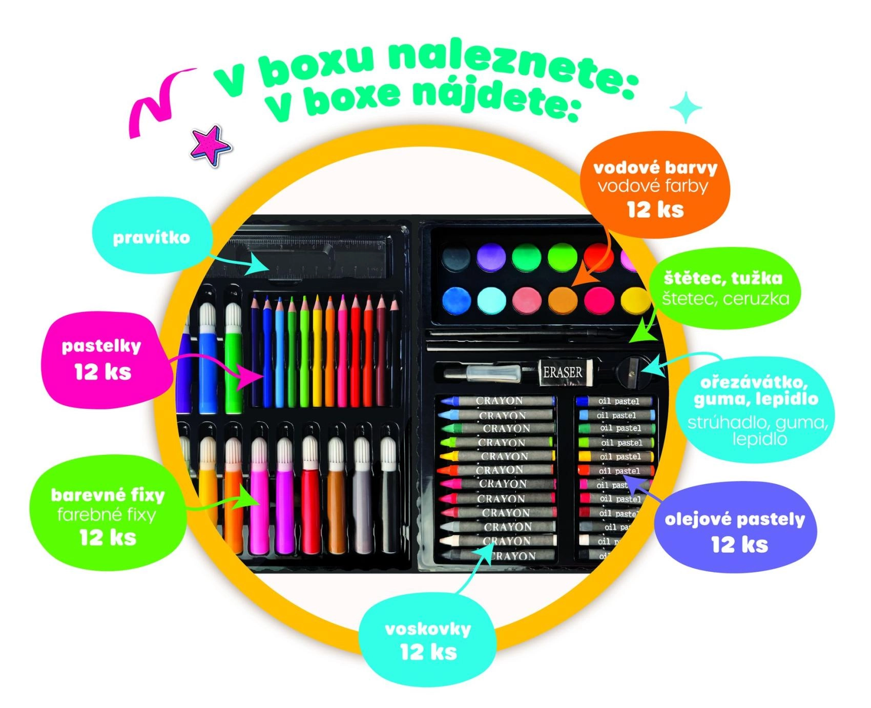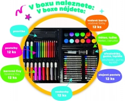 Praktisk kreativt sæt til små kunstnere i en robust plastkuffert, som tilbyder alt, hvad der behøves til maling og tegning. Ideelt derhjemme, i børnehaven og på farten. Indeholder et farverigt udvalg af redskaber, der udvikler børns fantasi og finmotorik, herunder farveblyanter, tuscher og vandfarver.
