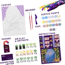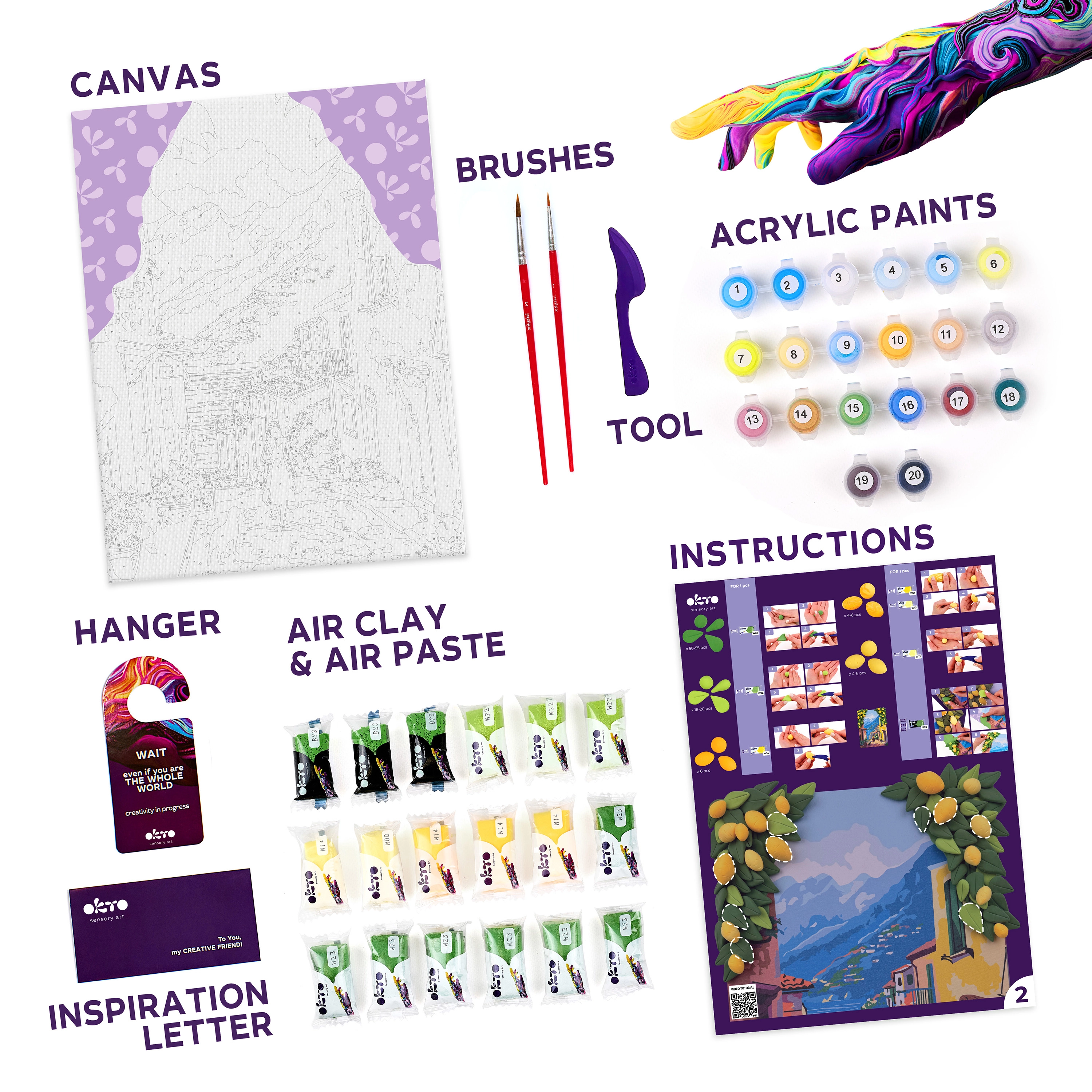 Pakken indeholder alt, hvad du behøver til at skabe – fra fortrykt lærred og farver til modelleringsmasse og værktøjer. Fremgangsmåden er enkel og kan håndteres selv af helt nye begyndere.