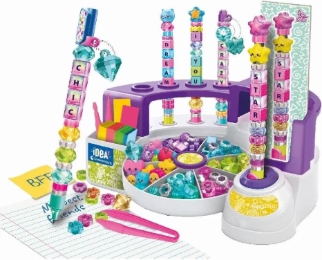 - Arbejdsstation, arbejdsplads til kreation, bogstaver, perler, klistermærker, farvede tuscher (afhængigt af pakke)