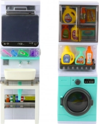 Dette detaljerede sæt til hjemmebadeværelset tilbyder alt til troværdig leg: håndvask med spejl, frontbetjent vaskemaskine, opbevaringsskab og masser af tilbehør. Spejlet lyser ved isætning af batteri, og vaskemaskinen har lys- og lydeffekter, som giver en mere realistisk oplevelse.