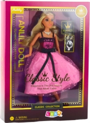 Oplev charmen ved ANLILY-dukken, der stråler i en pink‑sort gallakjole. Det lange blonde hår indbyder til at blive redt og sat, mens alle bevægelige lemmer muliggør dynamiske positurer og livlig leg.