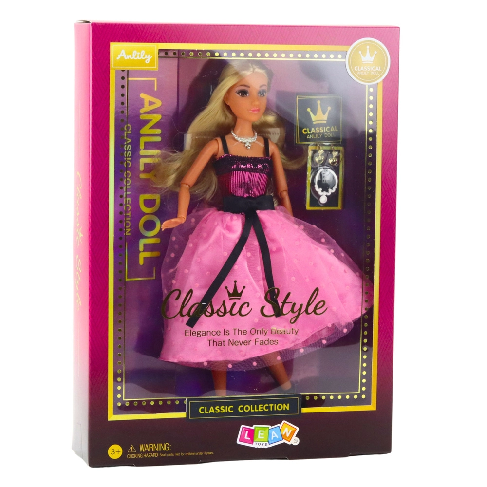 ANLILY-dukke i pink‑sort kjole, hvid halskæde, øreringe, sorte sko