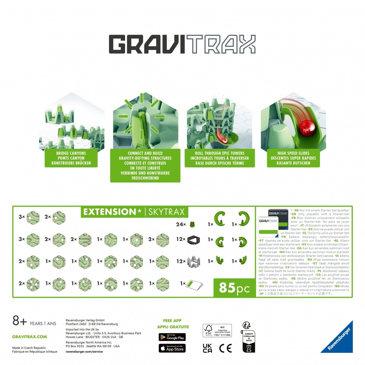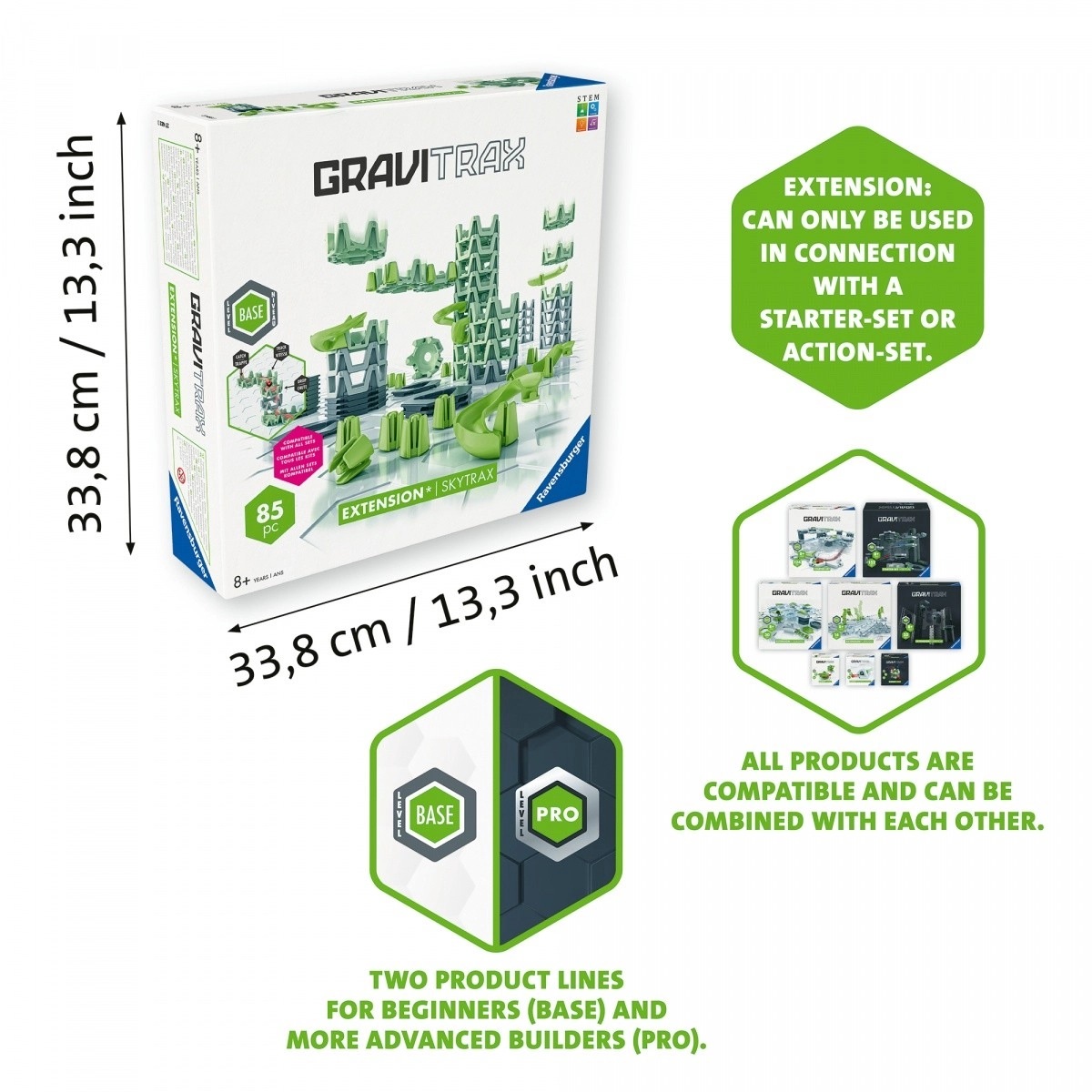 Udvidelsessættet GraviTrax Skytrax løfter dine kuglebaner bogstaveligt talt til nye højder. Særlige forbindelser og konstruktionsdele gør det muligt at bygge i flere niveauer og føre kuglerne over spillebasen ved hjælp af smart designede broer. Dermed skaber du baner fulde af fald, acceleration og glidende passager mellem niveauerne.