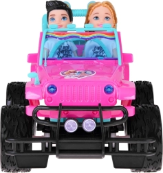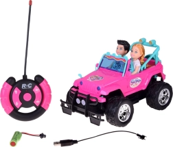 Sjovt sæt til små chauffører: en pink RC terrængående bil med store hjul og to figurer (pige og dreng). Bilen har forlygter, gummidæk for godt vejgreb, justerbare sikkerhedsseler på sæderne og styring i 4 retninger via en pink fjernbetjening. Inkluderer genopladeligt 3,7 V batteri med USB-opladning.