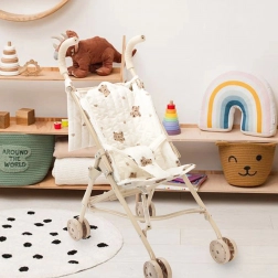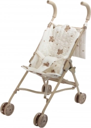 Denne stilfulde dukkevogn kombinerer komfort, sikkerhed og praktisk sammenklappelighed. Doble hjul giver en jævn kørsel, mens den robuste men lette konstruktion foldes til kompakt størrelse på ingen tid. Det cremefarvede sæde med et sødt bamsemotiv giver legen ekstra charme og inviterer til nye eventyr både hjemme og ude.