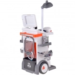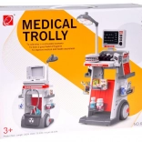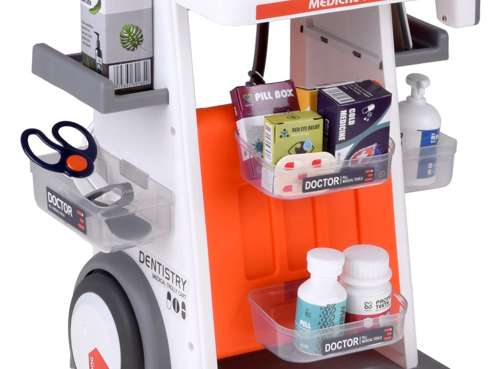 Robust konstruktion på hjul, flere hylder og bakker til overskuelig opbevaring af redskaber og “medicin”. Børn kan nemt tage vognen med overalt og har alt ved hånden.