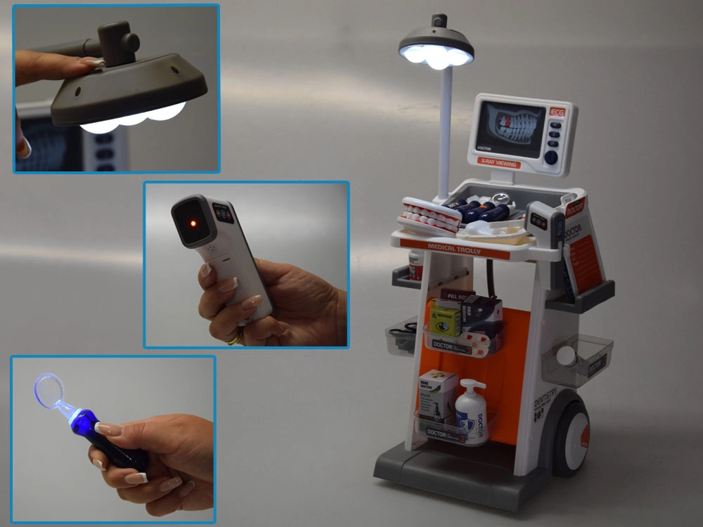 Stetoskopet bipper, termometeret afgiver signaler og lyser med rød LED, tandlægespejlet har hvid LED, og lampen giver et varmt, kraftigt lys. EKG afspiller hjerteslag og bip – en atmosfære som i klinikken.
