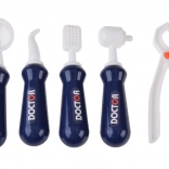 En åbnbar kæbemodel og en separat “tand” lærer korrekte tandplejevaner. Spejl, tandbørste og tandlægeinstrumenter støtter legende læring.