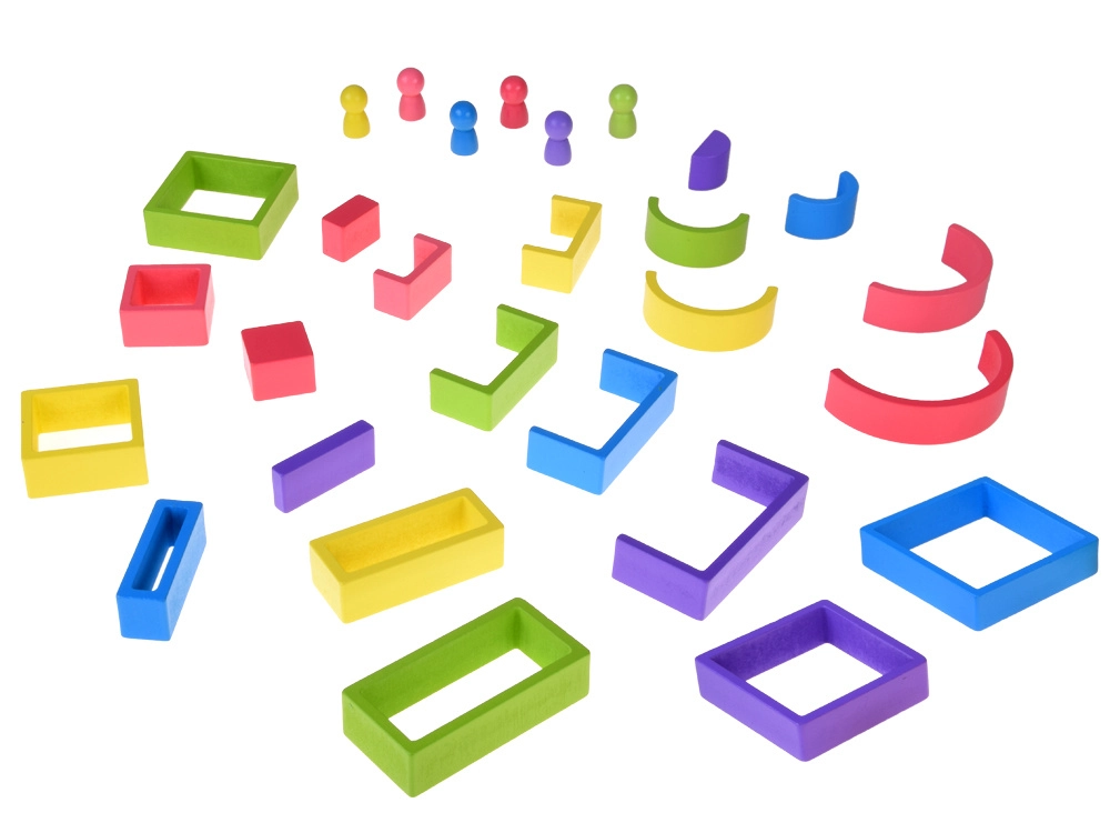 - Geometriske former (buer, rammer, broer, kvadrater, rektangler) og små figurer/brikker