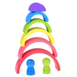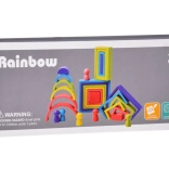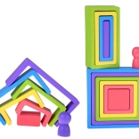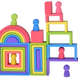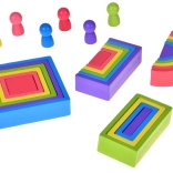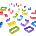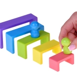 Denne farverige træsæt bringer åben leg inspireret af Montessori-metoden. Børn kan bygge tårne, broer, huse og abstrakte konstruktioner, sortere dele efter størrelse og farver eller indsætte og stable dem i hinanden. Legen udvikler kreativitet, rumlig forestillingsevne og logisk tænkning.