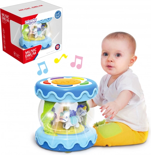 Den sjove og beroligende 3-i-1 tromme fra WOOPIE kombinerer en tromme, en spilledåse og en stjerneprojektor. Den tilbyder 6 lydfunktioner, blinkende lyseffekter og en rulle/roller til at støtte læring af at kravle. Ideel til sansestimulering og hjælp ved indsovning takket være sleep-tilstand efter 60 sekunders inaktivitet.