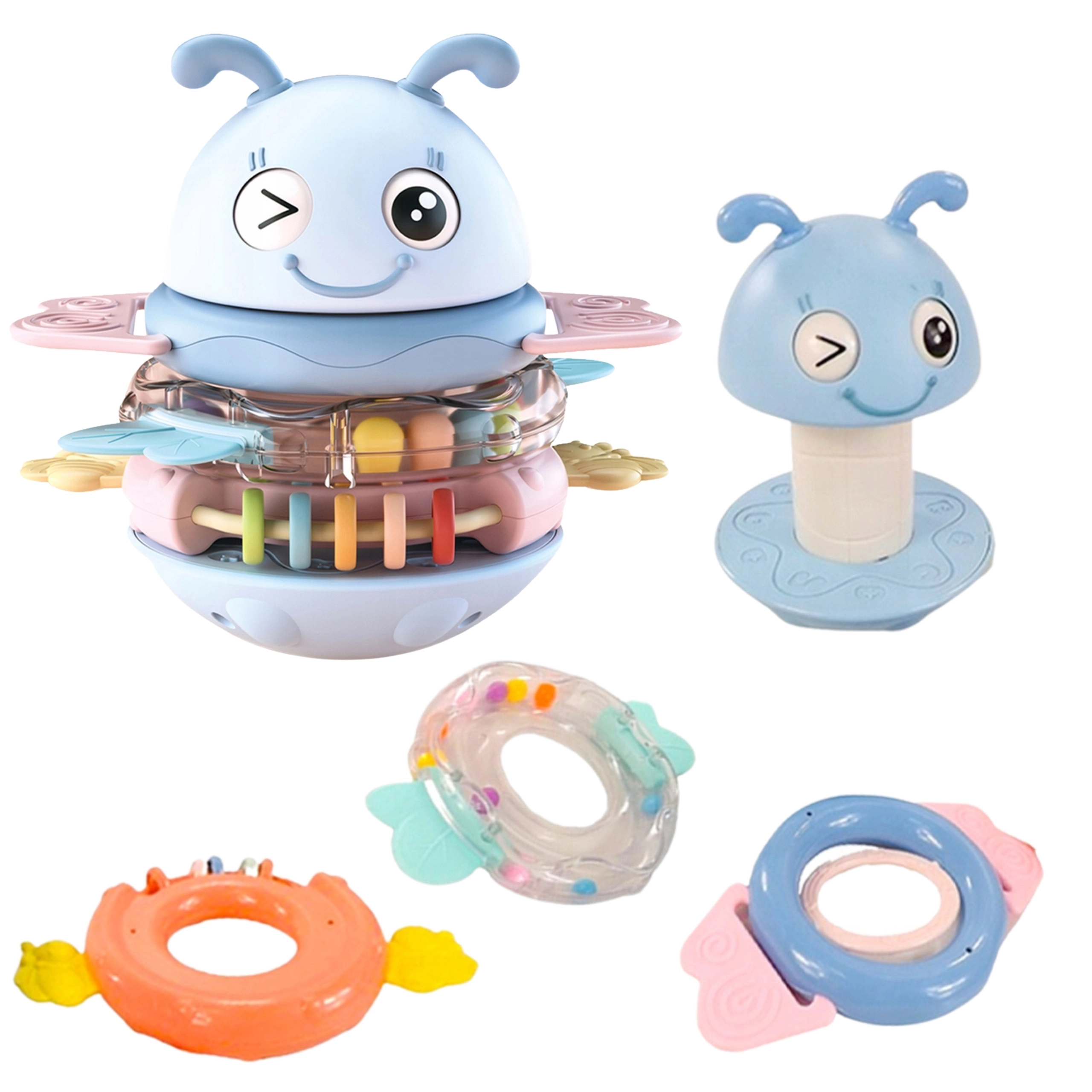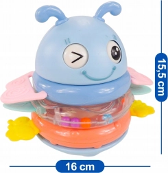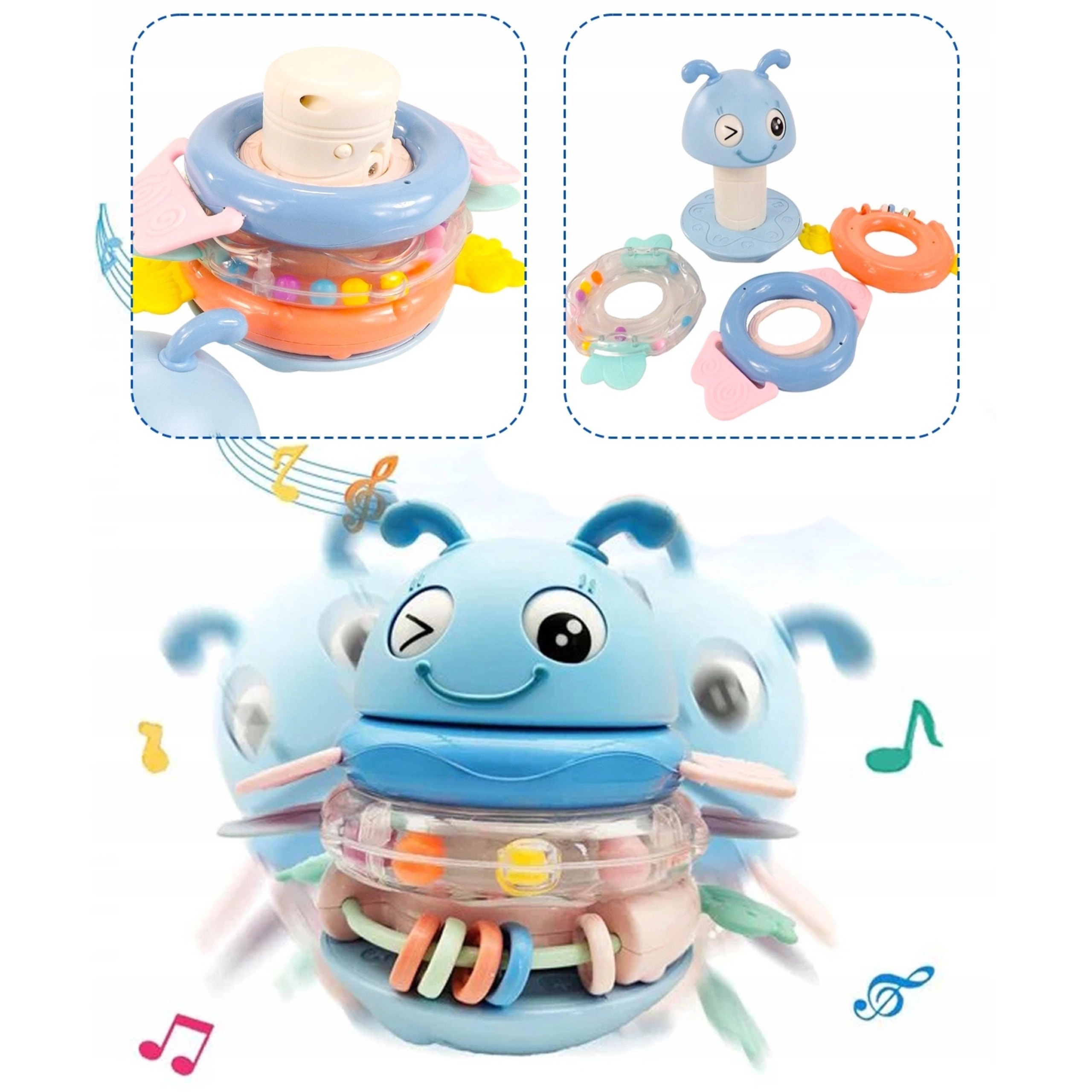 Denne søde “guldsmed” fanger babys opmærksomhed med farver, bevægelse og lyde. Ringene fungerer som rangler og bideringe og kan bruges hver for sig eller stables på pinden med 2 lydtilstande (melodier og sjove effekter). Takket være de bløde silikoneknopper masserer de nænsomt gummerne under tandfrembrud.