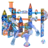 Dette store magnetiske byggesæt kombinerer gennemsigtige paneler, rør og buede dele til at skabe jævne baner, hvor kuglerne ruller fra et niveau til det næste. De stærke magnetiske samlinger holder stabilt, så børn trygt kan prøve nye varianter og forbedre deres konstruktion. Lysende kugler, projektører og kuppellys oplyser banen og forvandler legen til et magisk lysshow.