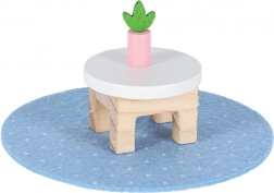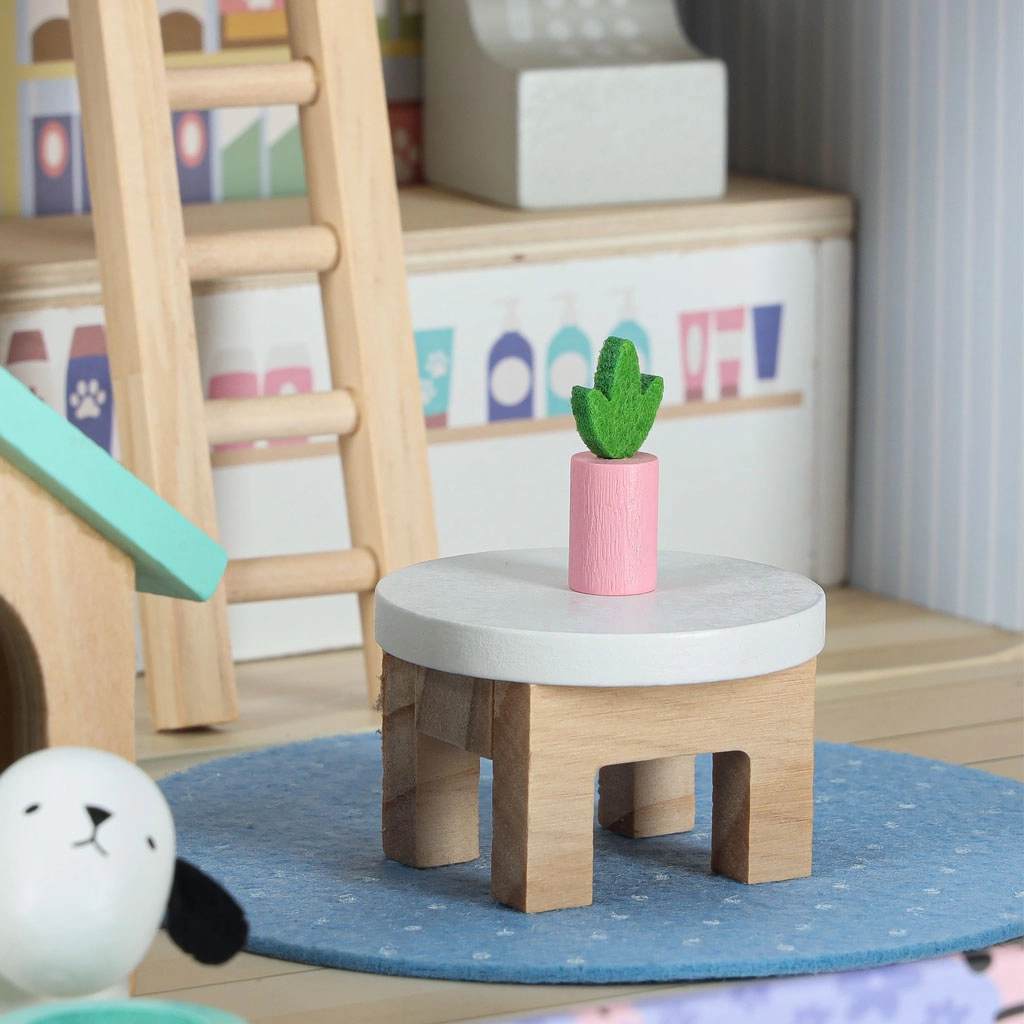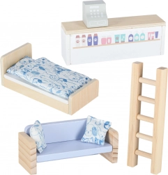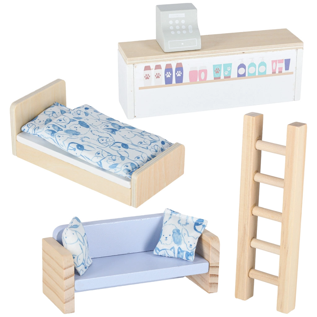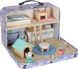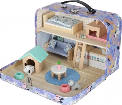 Sættet indeholder kvalitetstræmøbler (seng med sengetøj, sofa, bord, hylde, stige), elementer til en butik (disk og kasseapparat) samt et dyrehjørne med hundehus, kradsetræ til katten og to skåle. Takket være kuffertdesignet kan legetøjet nemt tages med på besøg, ferie eller legepladsen – og efter leg ryddes alt hurtigt op.