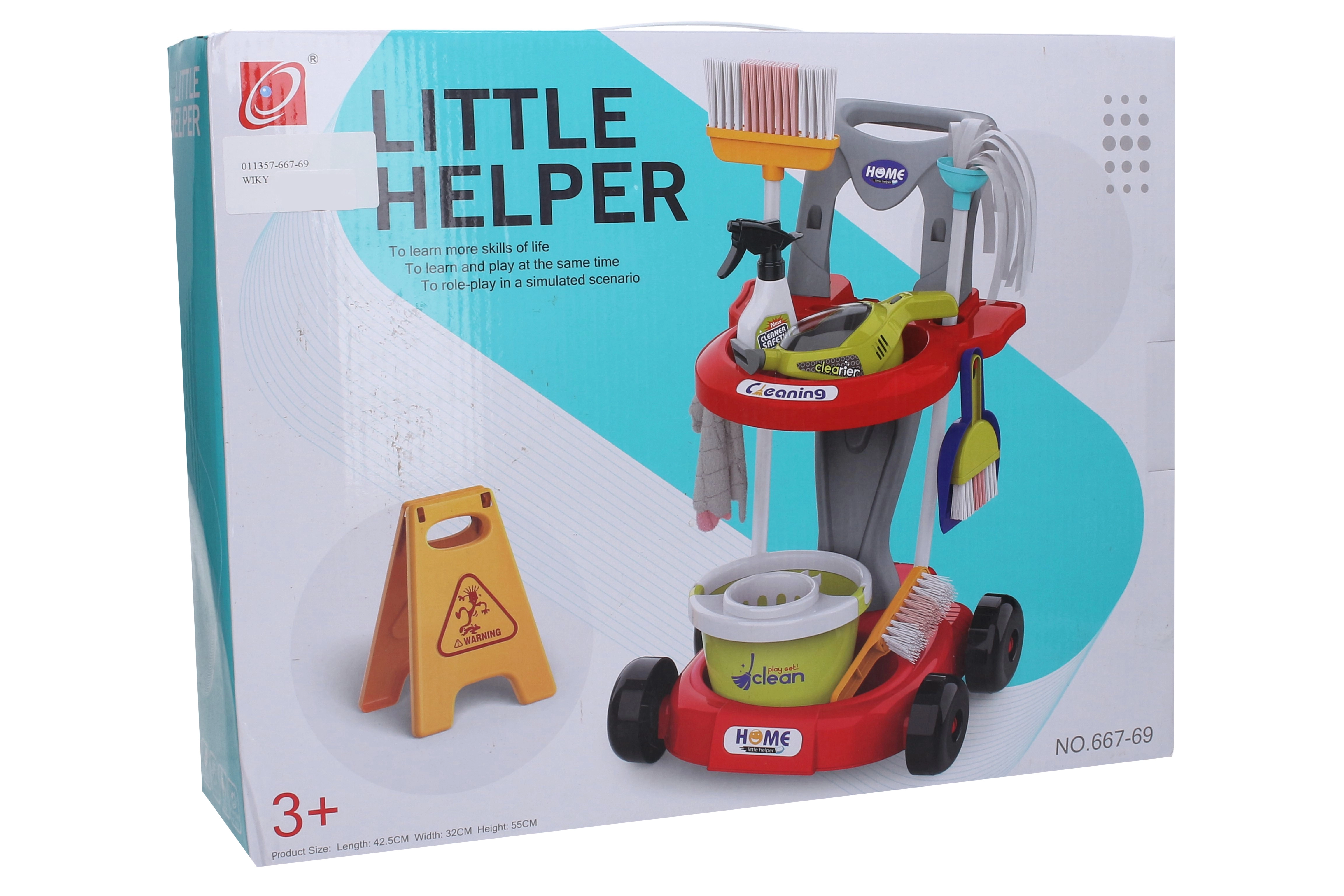 En sjov og praktisk børne-rengøringsvogn med en højde på 55 cm, som rummer alt, hvad der skal til for at lege hus. Sættet indeholder en vogn, fejebakke med håndkost, moppe, kost, håndstøvsuger, forstøver, spand og en advarselsskilt “Forsigtig, vådt gulv”. Samlingen er nem takket være den medfølgende vejledning, og støvsugeren kræver 3× AA-batterier (medfølger ikke).