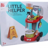 - Komplet udstyr til rengøringsleg: moppe, kost, håndkost med fejebakke, spand, forstøver, håndstøvsuger og advarselsskilt.