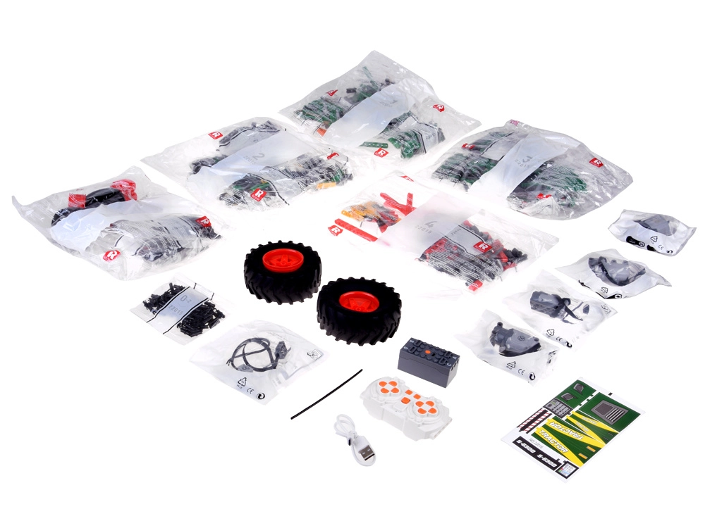 Pakken indeholder en overskuelig billedvejledning, klistermærker, USB-kabel og fjernbetjening. Byggesættet udvikler finmotorik, logisk tænkning og tekniske færdigheder – fra gear til servostyring.