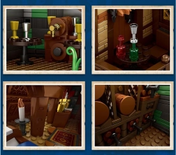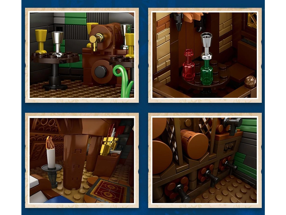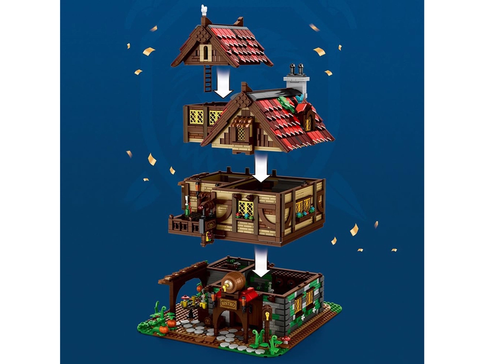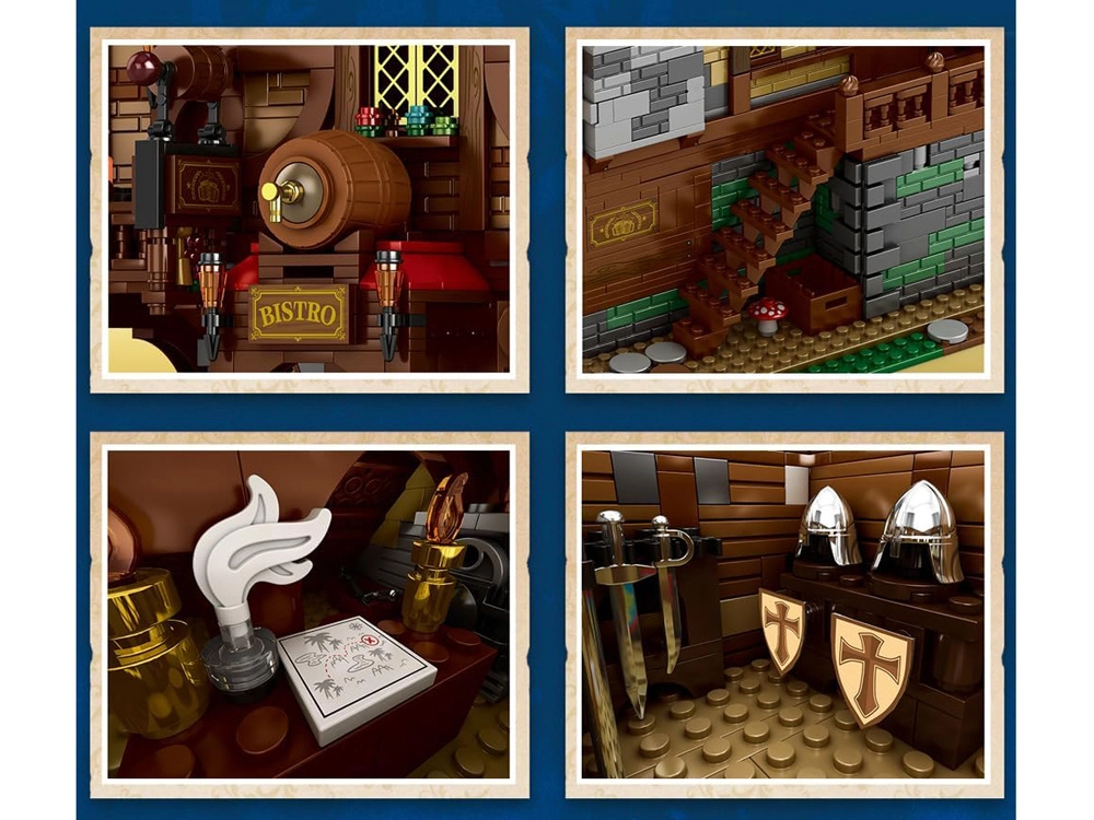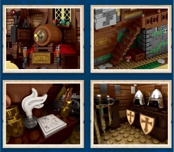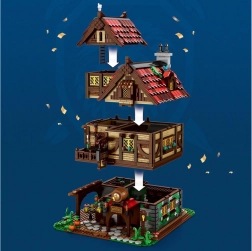 Denne store middelalderlige hytte/kro er det ideelle sted for riddere og adel efter krævende togter. Der venter dig et rigt udarbejdet interiør og eksteriør, fra tønde med "fadøl", over borde med bægre til våbenkammer med sværd og skjolde. Takket være de 2868 klodser bygger du en detaljeret bygning med flere niveauer og dekorationer, der støtter fantasi og historiefortælling.