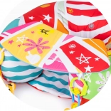 Takket være den bløde og stabile fyldning giver den sikker støtte, mens de farverige mønstre og interaktive elementer hjælper med at udvikle sanserne og hånd–øje-koordinationen. Det praktiske materiale er let at rengøre, så den er klar til hverdagens eventyr.